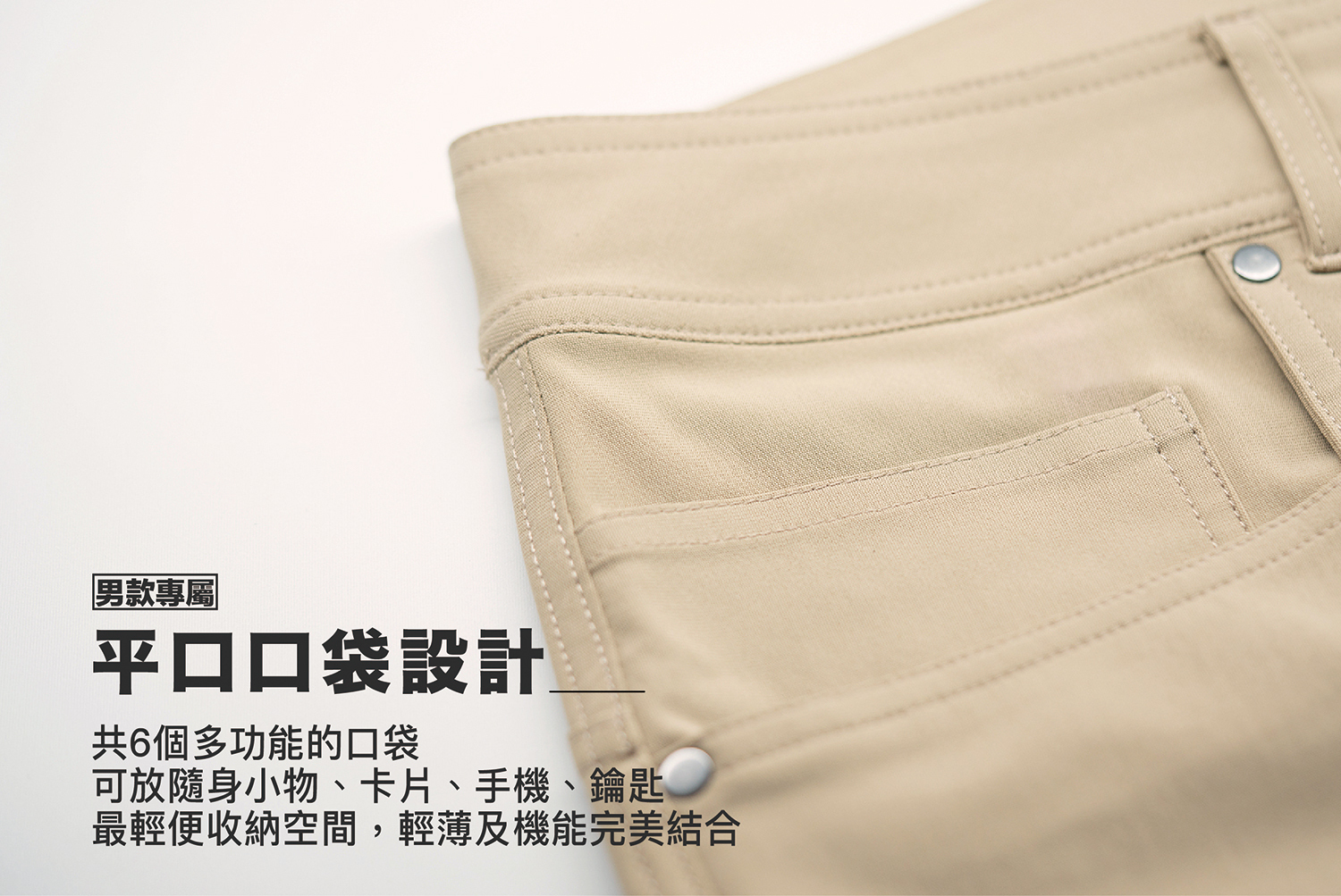 低調且質感優越,整件褲子擁有6個不同的口袋,創造更完美的口袋使用空間。