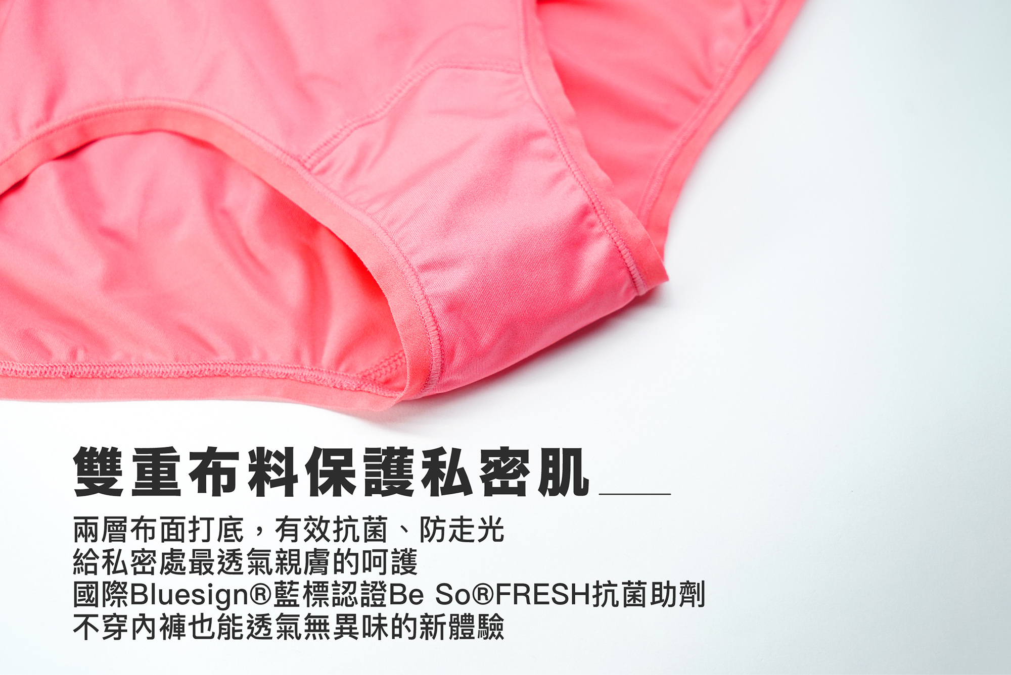 - 超輕盈、透氣排汗、抗菌除臭、防走光