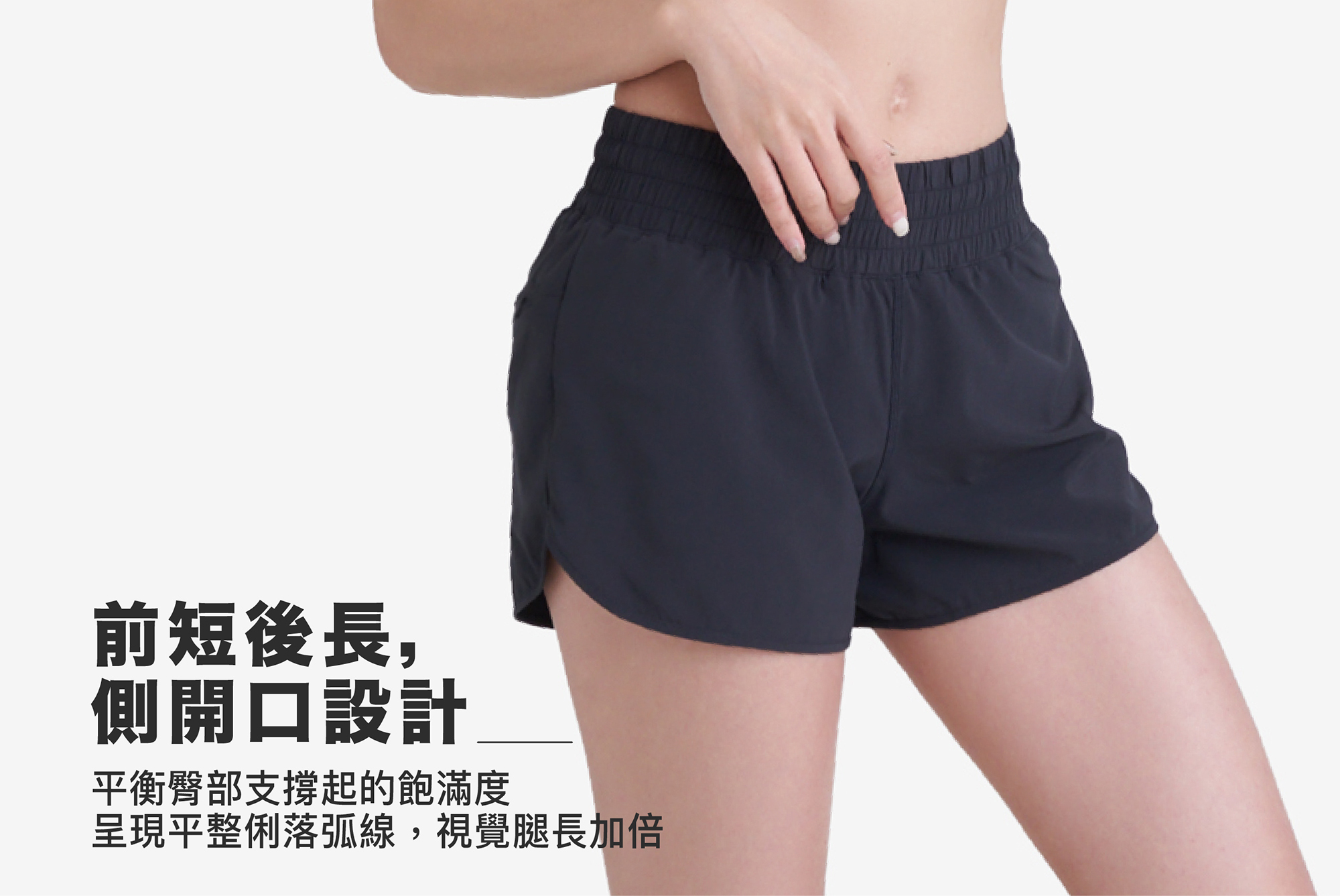 寬版的腰間鬆緊帶,收腹效果更加;前短後長與側邊開岔設計,視覺上更顯腿長。