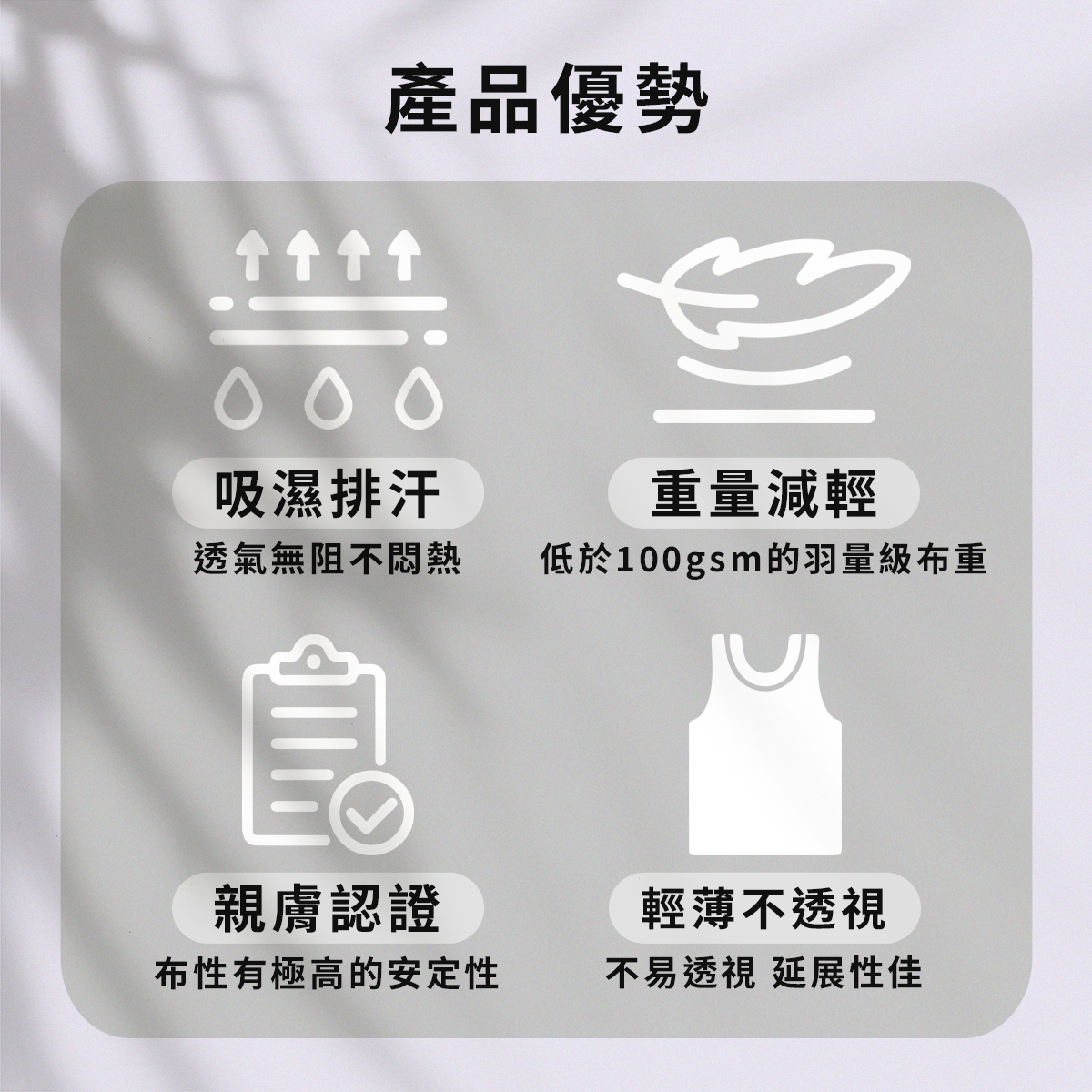 重量減輕-50%,小於100gsm的羽量級輕盈布重。