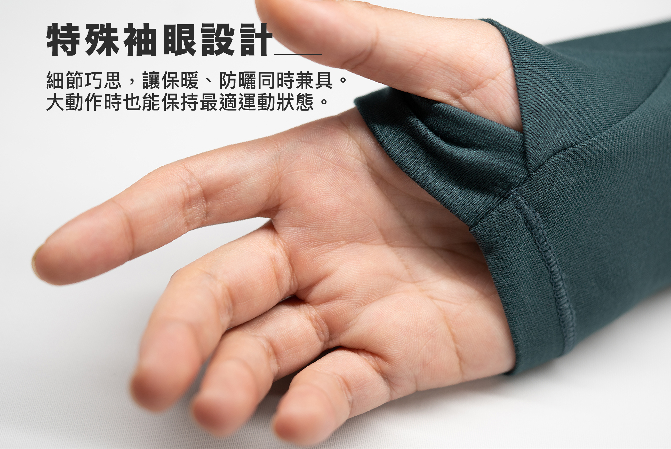 袖口的拇指套,給予妳在通勤或運動時能有更好的防曬與保暖作用。